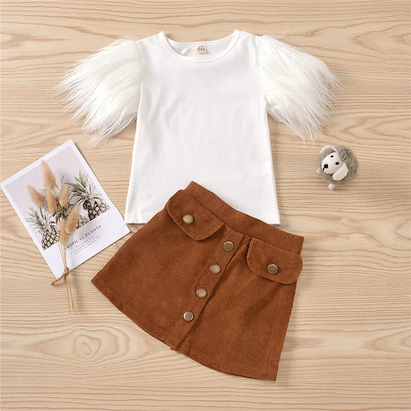This tee with a short fur sleeve outfit is the perfect basic to have in your little one's wardrobe. It has a fur sleeve and makes this tee looks so adorable. In a feminine A-line silhouette, this classic style features a high waist, two front pockets and has buttons down the front for a '70s vibe. It looks great with boots in the cooler months and sandals when it's warm.