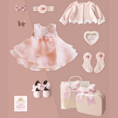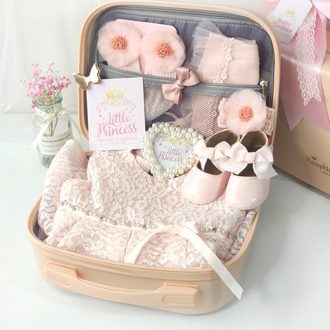 Hello, little princess! Here's a beautiful gift for you. This newborn baby gift set is perfect for all baby girls. It has all the essential pieces inside the multifunctional suitcase. In addition, it features a beautiful pink outfit/dress for the baby girl, socks, shoes, ponytails, and a cute photo frame. Sure to make your memories of your baby's first outfit most remarkable. Perfect for baby shower gifts to a newborn baby, birthdays, or any other special occasion. A must-have set for all little princesses!