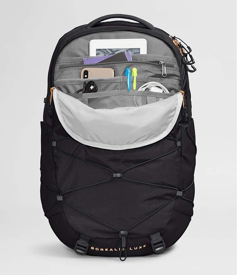 The Women’s Borealis Backpack is now available in a Luxe version, that has premium metallic accents. With its iconic bungee cord system, women-specific FlexVent™ suspension system and large interior compartment, you can keep your items secure, inside and out. This go-anywhere pack also features a stand-up design, sternum strap, removable waist belt and protective laptop compartment.